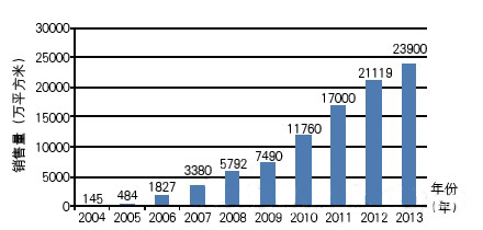 根據(jù)中國(guó)印刷及設(shè)備器材工業(yè)協(xié)會(huì)對(duì)全國(guó)版材生產(chǎn)企業(yè)的統(tǒng)計(jì)顯示,2013年我國(guó)本土實(shí)際生產(chǎn)膠印版材總產(chǎn)量已達(dá)3.46億平方米。其中,CTP版的生產(chǎn)量為2.45億平方米,同比增長(zhǎng)11%;CTP版的總銷售量達(dá)2.39億平方米,同比增長(zhǎng)13%?! ∥覈?guó)CTP版的起步階段較長(zhǎng),2004年國(guó)內(nèi)CTP版基本依靠進(jìn)口。然而經(jīng)過(guò)近十年的努力,現(xiàn)在我國(guó)本土生產(chǎn)的CTP版除了可滿足國(guó)內(nèi)不斷增長(zhǎng)的需求之外,還有較大量的出口。特別是2010~2013年,國(guó)內(nèi)CTP版用戶數(shù)量大增,促進(jìn)了CTP版產(chǎn)銷量直線上升。圖1顯示出2004~2013年我國(guó)本土生產(chǎn)的CTP版銷售量情況。