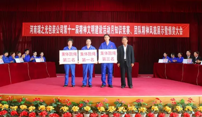 4月29日下午,河南瑞之光包裝印刷股份有限公司舉行第十一屆“精神文明建設(shè)活動(dòng)月”知識(shí)競賽、團(tuán)隊(duì)精神風(fēng)貌展示暨頒獎(jiǎng)大會(huì)。河南瑞之光文化產(chǎn)業(yè)集團(tuán)總裁張歌偉攜集團(tuán)領(lǐng)導(dǎo)班子出席此次活動(dòng)。活動(dòng)現(xiàn)場根據(jù)公司《愛心基金管理辦法》進(jìn)行愛心基金捐款,隨后,開展了知識(shí)競賽和團(tuán)隊(duì)精神風(fēng)貌展示,經(jīng)過各參賽隊(duì)伍的激烈角逐和評(píng)委們的認(rèn)真選評(píng),現(xiàn)場評(píng)出冠、亞、季軍并當(dāng)場頒獎(jiǎng)。