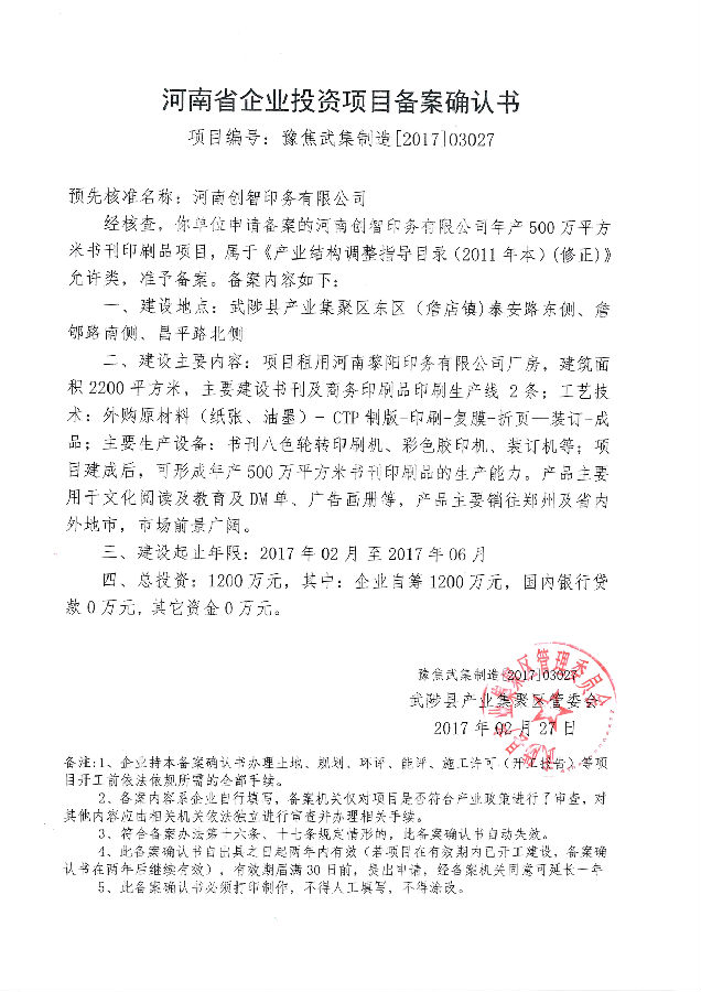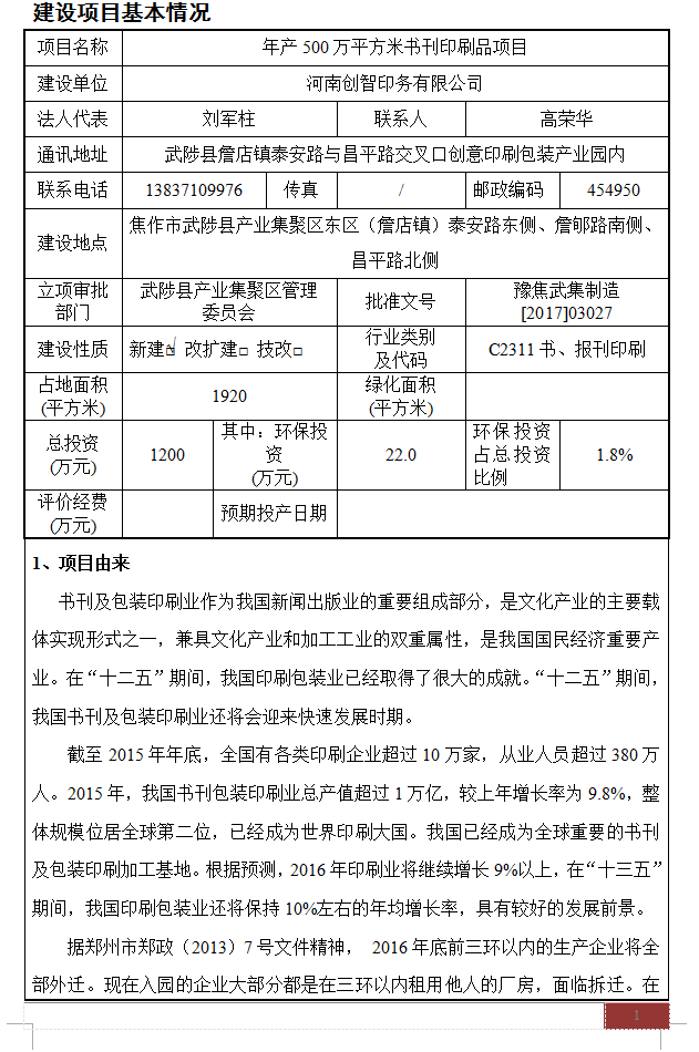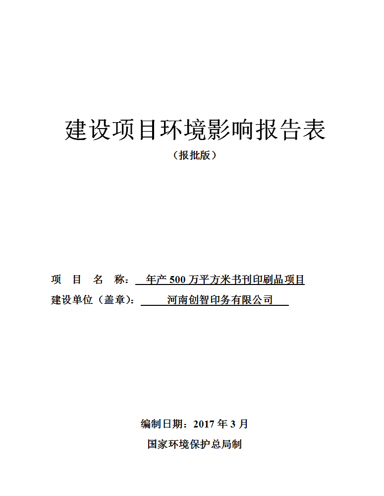 河南創(chuàng)智印務(wù)有限公司年產(chǎn)500萬(wàn)平方米書(shū)刊印刷品項(xiàng)目