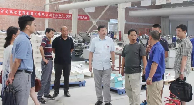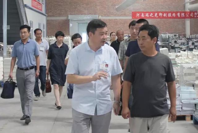7月20日上午,國家新聞出版廣電總局質(zhì)檢中心張軍老師一行到瑞之光集團生產(chǎn)基地檢查指導工作,河南省新聞出版廣電局質(zhì)檢中心王連琴副主任、印刷發(fā)行管理處暢通、中原大地傳媒股份有限公司教材中心周雪香老師等陪同領(lǐng)導檢查指導。河南瑞之光文化產(chǎn)業(yè)集團副總裁王子峰與生產(chǎn)基地總經(jīng)理王在東熱情接待各位領(lǐng)導。檢查過程中,王總認真介紹瑞之光集團公司生產(chǎn)基地的廠容廠貌以及今年季度教材生產(chǎn)進度與質(zhì)量管控;隨后陪同各位領(lǐng)導現(xiàn)場觀看生產(chǎn)車間與產(chǎn)品展示大廳;最后總局領(lǐng)導對瑞之光集團生產(chǎn)基地各項工作表示肯定。