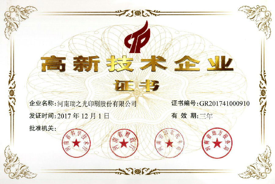 近日,河南瑞之光印刷股份有限公司順利通過(guò)了國(guó)家高新技術(shù)企業(yè)認(rèn)定。