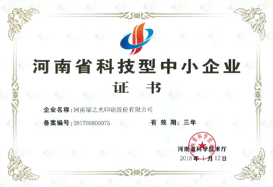 近日,河南瑞之光印刷股份有限公司被河南省科學技術(shù)廳認定為“河南省科技型中小企業(yè)”,此次證書的取得,是省科技廳對我公司的科研能力和整體技術(shù)水平的肯定和認可。