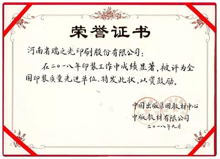 近日,由中國出版集團教材中心、中版教材有限公司組織的全國中版教材代印廠質(zhì)量綜合評比中,河南瑞之光印刷股份有限公司因在2018年印裝工作中成績突出,被評為全國印裝質(zhì)量先進單位。瑞之光印刷將繼續(xù)在印裝質(zhì)量、交貨周期以及綜合服務(wù)上再接再厲,再創(chuàng)佳績。