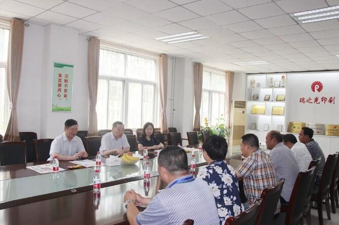 7月19日下午,河南省委宣傳部巡視員馬志、版權(quán)和印刷發(fā)行處副處長(zhǎng)唐歆、反非法反違禁處副處長(zhǎng)翟紹午等領(lǐng)導(dǎo)蒞臨河南瑞之光文化產(chǎn)業(yè)集團(tuán)視察調(diào)研。瑞之光集團(tuán)總裁張歌偉、瑞之光印刷公司董事長(zhǎng)王子峰、總經(jīng)理張穎、瑞光印務(wù)總經(jīng)理王鳳生等陪同調(diào)研。