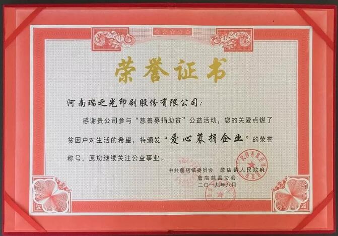8月29日,由詹店鎮(zhèn)黨委、人民政府和詹店慈善協(xié)會共同主辦的“行善有道、善行天下——2019年武陟縣詹店鎮(zhèn)大型慈善募捐晚會”在詹店鎮(zhèn)非公企業(yè)黨工服務(wù)中心舉辦,瑞之光印刷公司積極參與此次募捐活動,捐款人民幣25000元,體現(xiàn)了瑞光人扶貧助困、奉獻(xiàn)愛心的社會責(zé)任感。