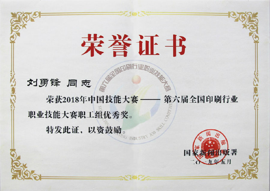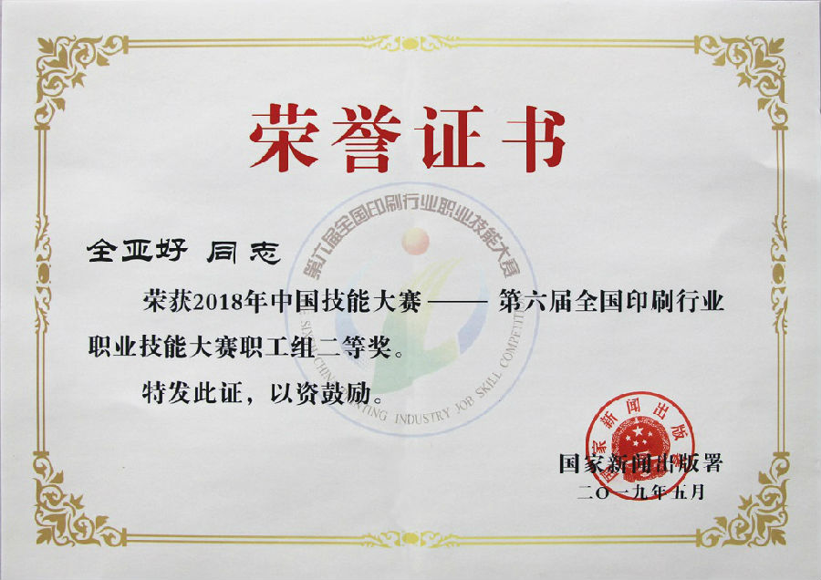 在國家新聞出版署與人力資源社會保障部聯(lián)合主辦的2018年中國技能大賽——第六屆全國印刷行業(yè)職業(yè)技能大賽上。瑞之光印刷公司員工全亞好、劉勇鋒在初賽中脫穎而出,進(jìn)入全國總決賽,并取得佳績。全亞好榮獲職工組二等獎(印品整飾工),被授予“全國印刷行業(yè)技術(shù)能手”榮譽稱號;劉勇鋒榮獲職工組優(yōu)秀獎(印品整飾工)。